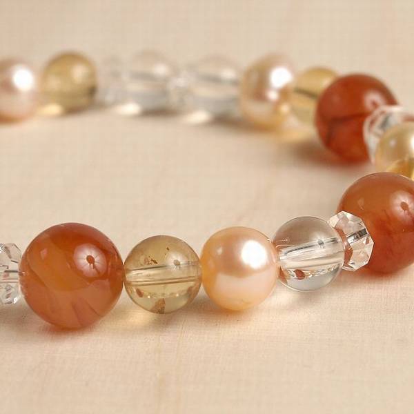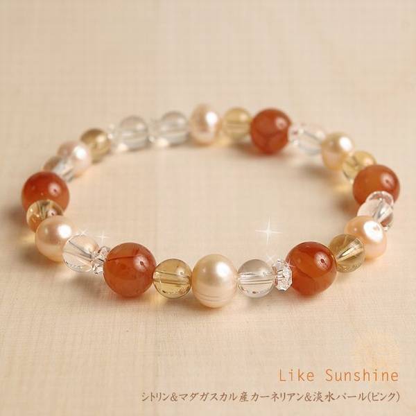 2017/08/20 瑠美さん やさしいおひさまのぬくもりを連想するようなパワーストーンブレスレットです。オレンジ色のカーネリアンとほんのりピンク色の淡水パール、幸せ色の黄色いシトリン、そして透明な水晶。とてもきれいないろどりのハーモニーで、やさしく包み込まれるような気持になれます。仕事で緊張が続いた時などは、ブレスレットの輝きが緊張を解きほぐしてくれて、前進する勇気をもらえるように感じます。凛とした雰囲気も感じられるオトナかわいいブレスレットだと思います。お店の対応もとても親切で、希望した日時に届けていただきました。これからもリピートさせていただきます。 評価 ★★★★★